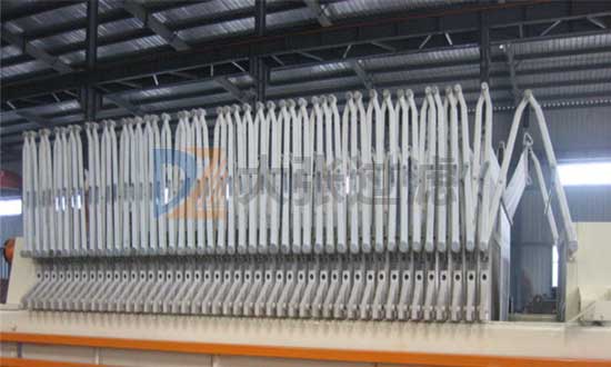 滤布曲张系统可使压滤机在工作时能够改变滤布倾斜角度,成倒V字形,同时持在滤布上的弹簧因伸缩而产生抖动, 使滤饼自动脱落。曲张杆采用增强聚丙烯材质,重量轻、耐腐蚀,具有动作灵活可靠、维护 方便等特点。